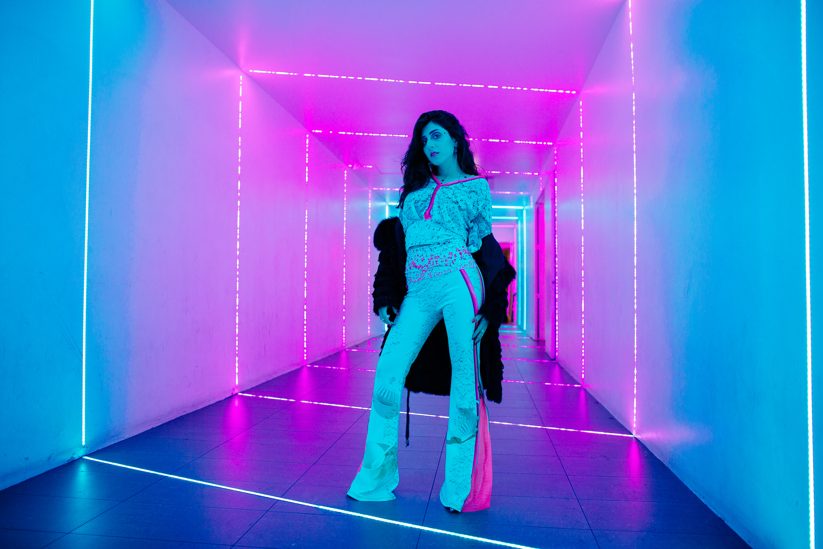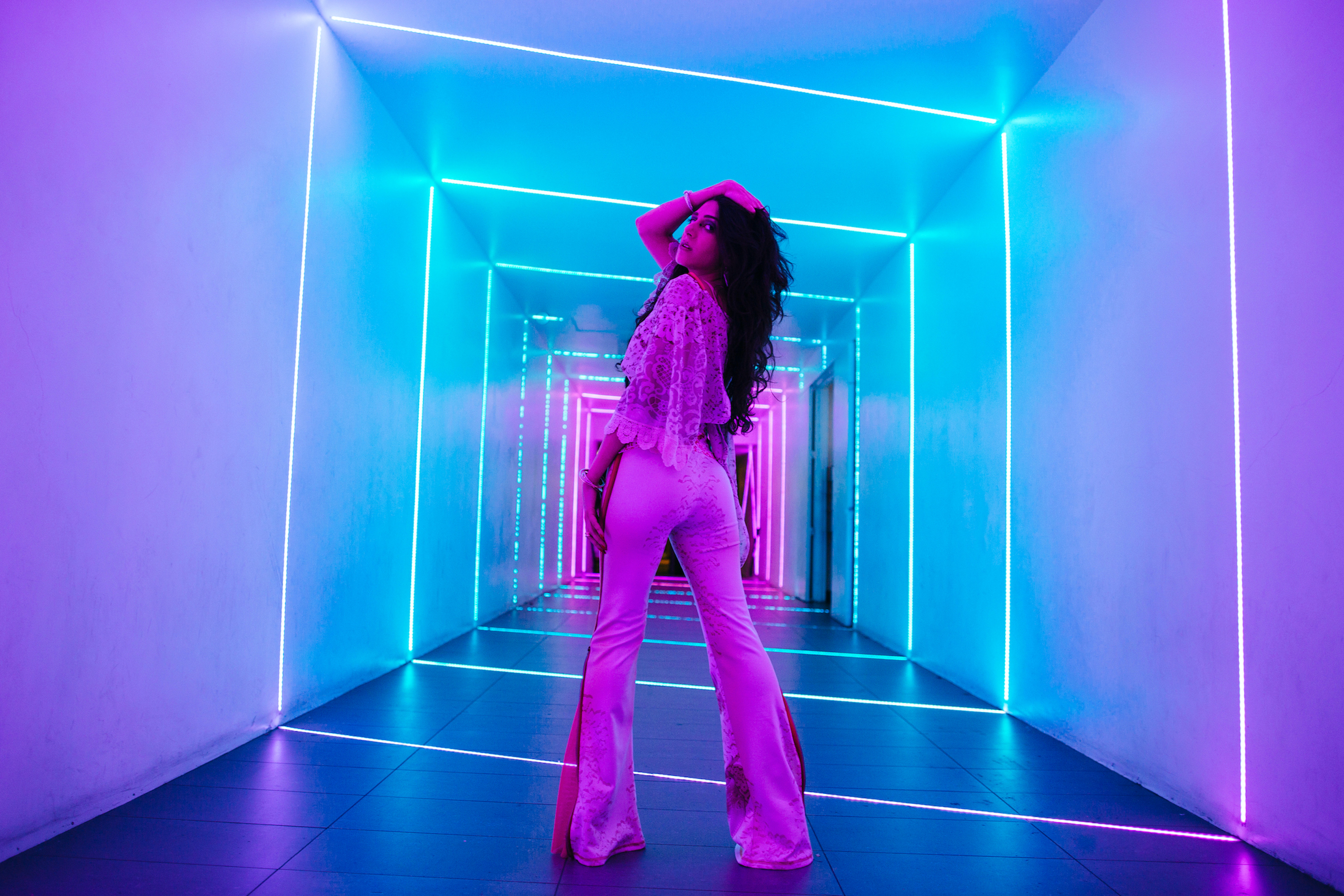 Farrah Mechael poses in a striking blue-lit tunnel, reflecting the energy and vision behind “Encore.”