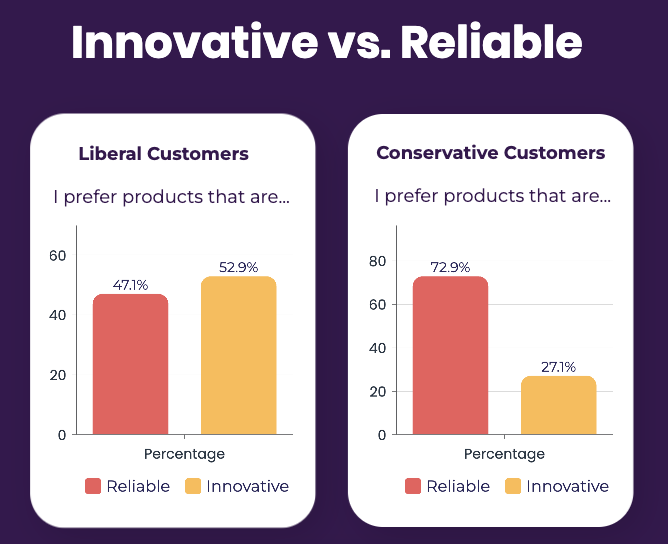 Bar graph showing innovation vs. reliability preferences among liberal and conservative consumers.